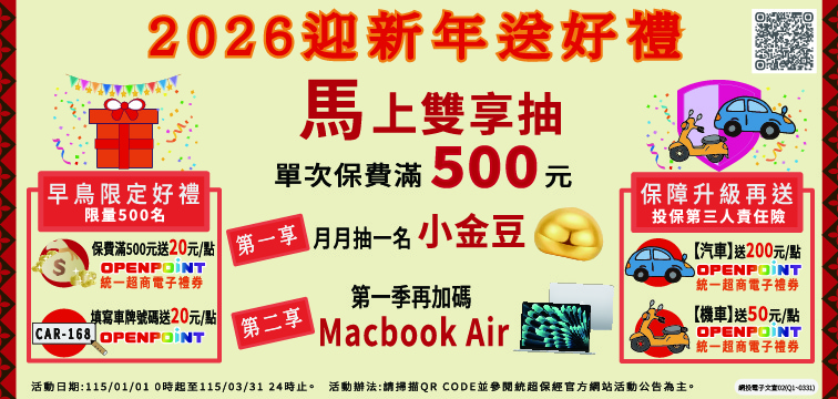 ●投保任一險種,單筆保費達500元贈OPENPOINT 20點或統一超商電子禮券20元(限額500名贈完為止)。