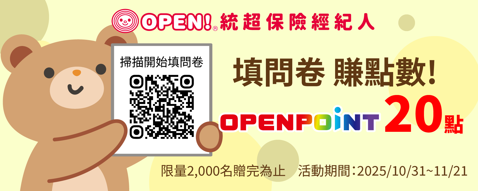 四、 活動內容:活動期間完成填寫網路投保體驗問卷,可獲得OPENPOINT 20點,限量2,000名贈完為止。